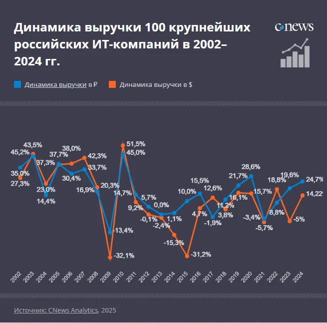 CNews Analytics впервые публикует рейтинг 500 крупнейших российских компаний. В 2024 г. их суммарная выручка без учета НДС достигла почти ₽3,3 трлн. Если говорить о компаниях только из первой сотни, то они заработали почти ₽2,8 трлн. Им удалось увеличить выручку за год на 24,7%. При сравнении досанкционного 2021 г. и прошедшего 2024 г., позитивная динамика составила 41%. Основными драйверами развития остаются импортозамещение, которое перешло на качественно иной уровень, и государственная поддержка. За последние пару лет российские компании серьезно нарастили экспертизу и расширили портфель решений, стали выходить на рынки дружественных стран, которые по примеру России хотят избавиться от зависимости от западных решений. Впереди — перестройка цифрового фундамента для укрепления технологического суверенитета государства.
